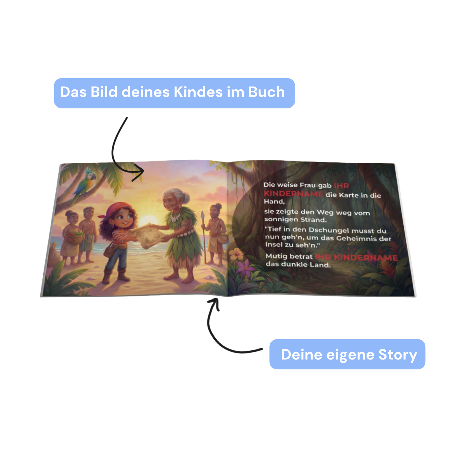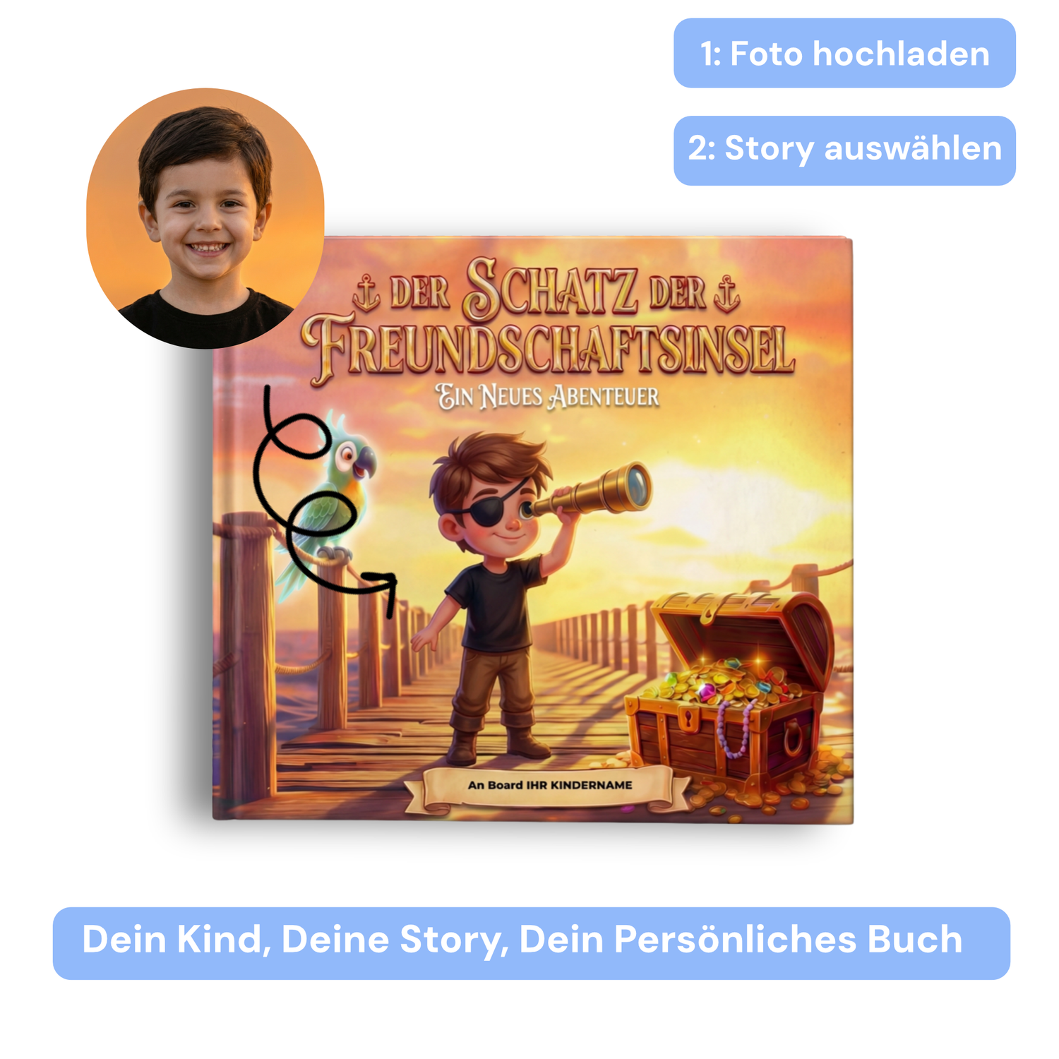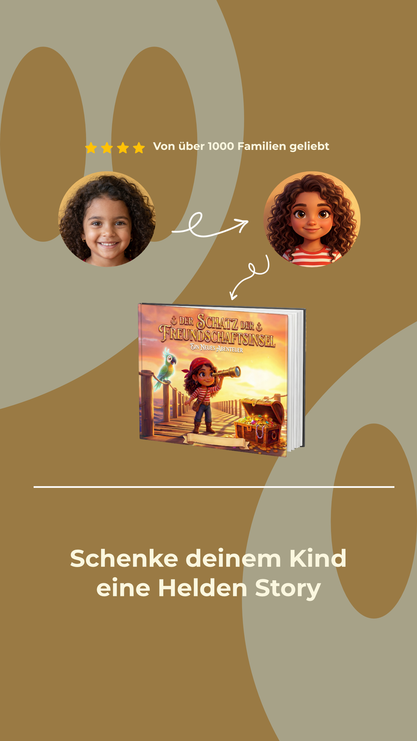 Es ist ganz einfach: Du lädst ein Foto deines Kindes hoch und konfigurierst Namen und Aussehen. Unsere spezielle Technologie verwandelt das Foto in eine magische, illustrierte Charakter-Figur, die deinem Kind verblüffend ähnlich sieht. Dieser Charakter wird dann die Hauptrolle in unserem Abenteuerbuch „Der Schatz der Freundschaftsinsel“ spielen.